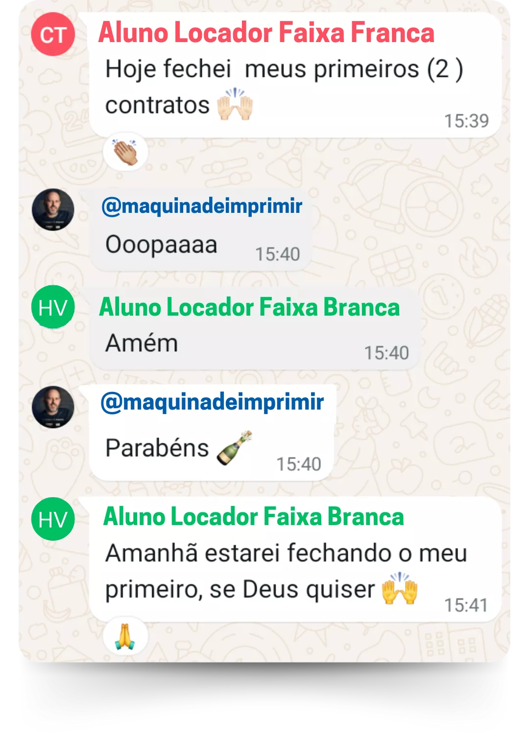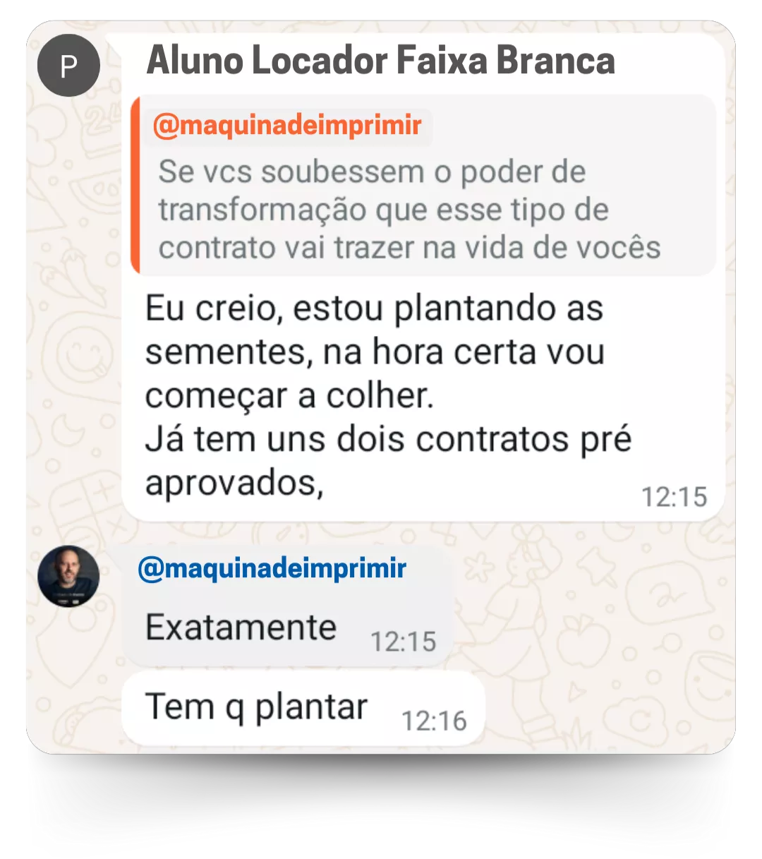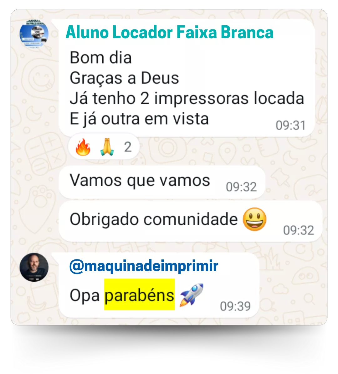 "Antes do curso, eu só fazia manutenções em impressoras, vendia suprimentos de informática mas vivia preocupado com as contas. Hoje, tenho contratos que me garantem mais de R$ 5.300,00 por mês. Minha vida mudou completamente depois que comecei a fazer Gestão de Impressão, trabalho com mais tranquilidade e sei que posso dar cada vez mais conforto para minha família, ajudar meus funcionários e fazer minha empresa prosperar." – Rafael dos S. Araújo, Aluno Locador Faixa Branca Turma #1